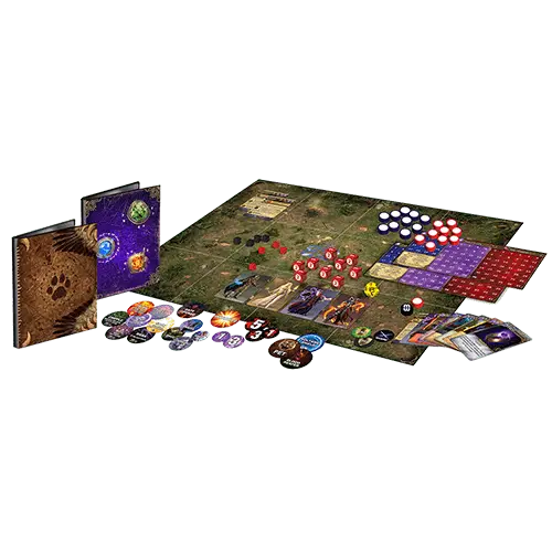 Mage Wars Arena is a tactical board game, a combination of a card game and miniatures game, combining the best elements from each genre. The game is played on an arena game board divided into square areas called “zones”, which regulate movement and the placement of objects. Each Mage (player) starts in a corner of the arena, opposite his enemy. The base game comes with all you need to get started: spellbooks, extra spells to customize with the spellbooks, arena game board, dice, markers, etc. The game is NOT collectible, but is fully customizable!
