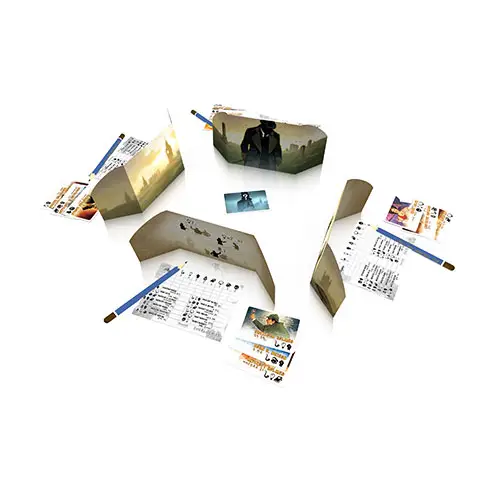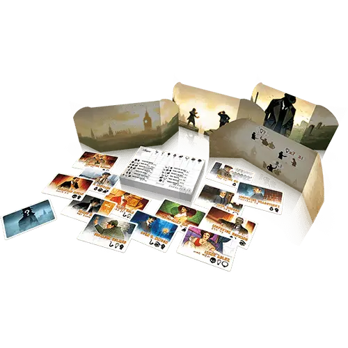 The game consists of 13 character cards, with 2 to 3 characteristics each. Each characteristic is shared by 3 to 5 characters. The cards are shuffled and one is drawn and put aside. This card represents the disguise chosen by Arsene Lupin. The other cards are distributed evenly among the players. The players now tally the total of characteristics they have on their cards (e.g. 2 detectives, 1 female, 0 genius etc) and note them for later use.